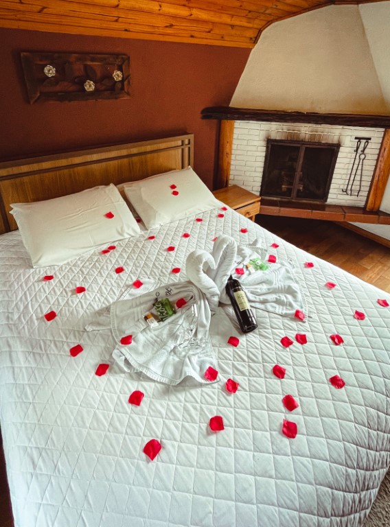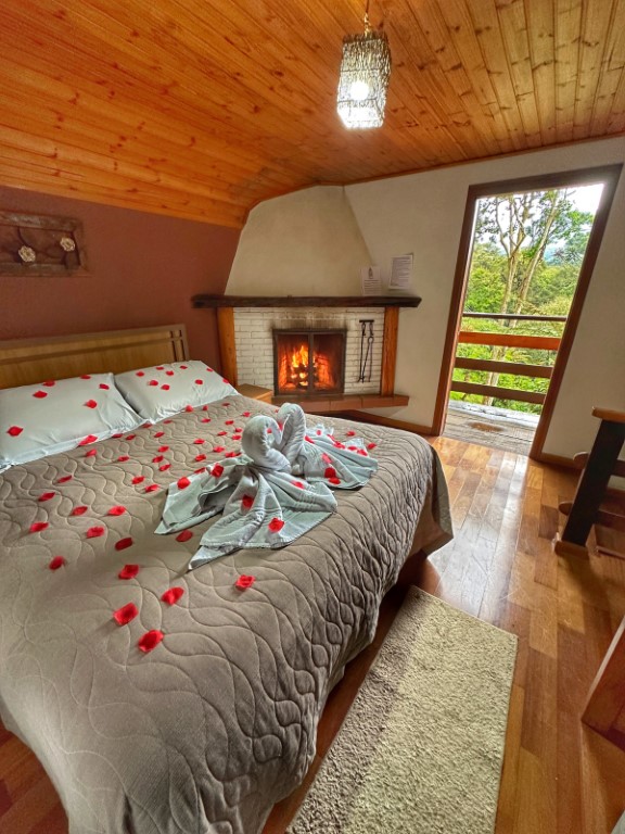 Acomoda até 02 pessoas. O ambiente possui: cama de casal queen, TV 32, guarda roupa personalizado, varanda, lareira, wi-fi, frigobar, mesa com acentos, suíte com duchas super quentes aquecida a gás e roupas de cama e banho. Não é permitido crianças nessa acomodação