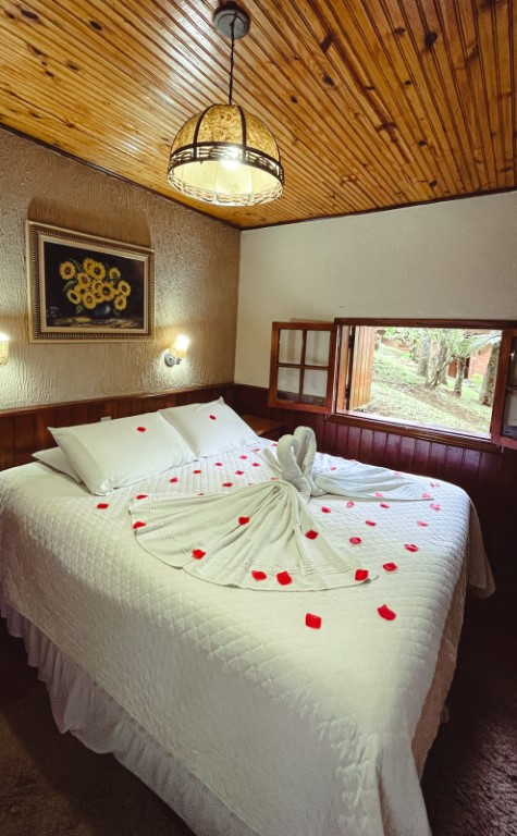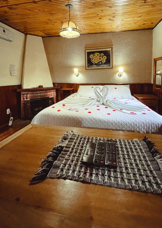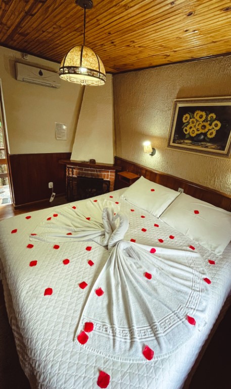 Acomoda até 02 pessoas. O ambiente possui: cama de casal queen, TV 32, guarda roupa personalizado, hidromassagem, varanda, lareira, aquecedor, wi-fi, frigobar, mesa com acentos, suíte com duchas super quentes aquecida a gás e roupas de cama e banho.Não é permitido crianças nessa acomodação