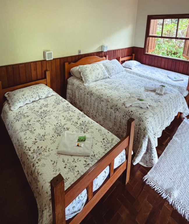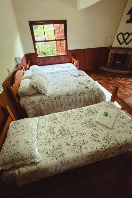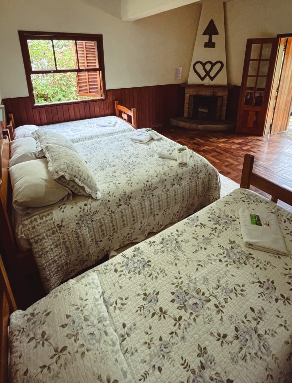 Acomoda até 04 pessoas. O ambiente possui: cama de casal, 2 camas de solteiro, TV 32, guarda roupa personalizado, varanda, lareira, wi-fi, frigobar, mesa com acentos, suíte com duchas super quentes aquecida a gás e roupas de cama e banho.
